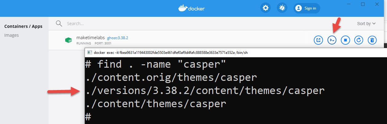 We also need to understand where the default template (Casper) is located within the container. The easiest way to accomplish this is to run the container and open a terminal to browse the container files.