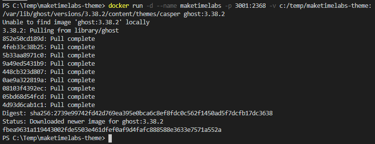 docker run -d --name maketimelabs -p 3001:2368 -v c:/temp/maketimelabs-theme:/var/lib/ghost/versions/3.38.2/content/themes/casper ghost:3.38.2