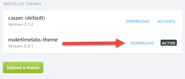 First things first, we need to download our existing theme for modification. You can browse your design admin page at yourdomainname.com/ghost/#/settings/design/change-theme. At the bottom of the design page, you will find your installed themes. Download your active theme.