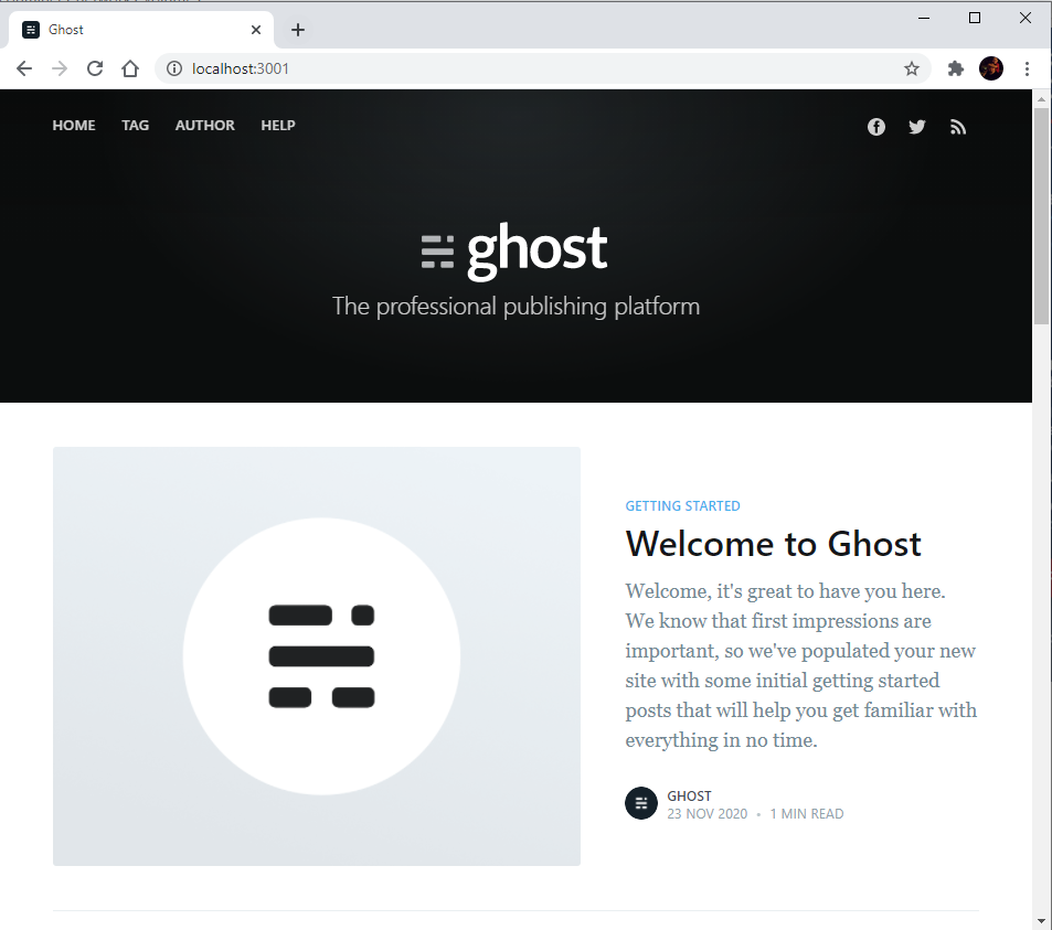 After starting the container, browse to http://localhost:3001 to see Ghost Blog. This will operate the same as a fresh install of Ghost Blog with the inclusion of any changes you may have made to the template we linked.