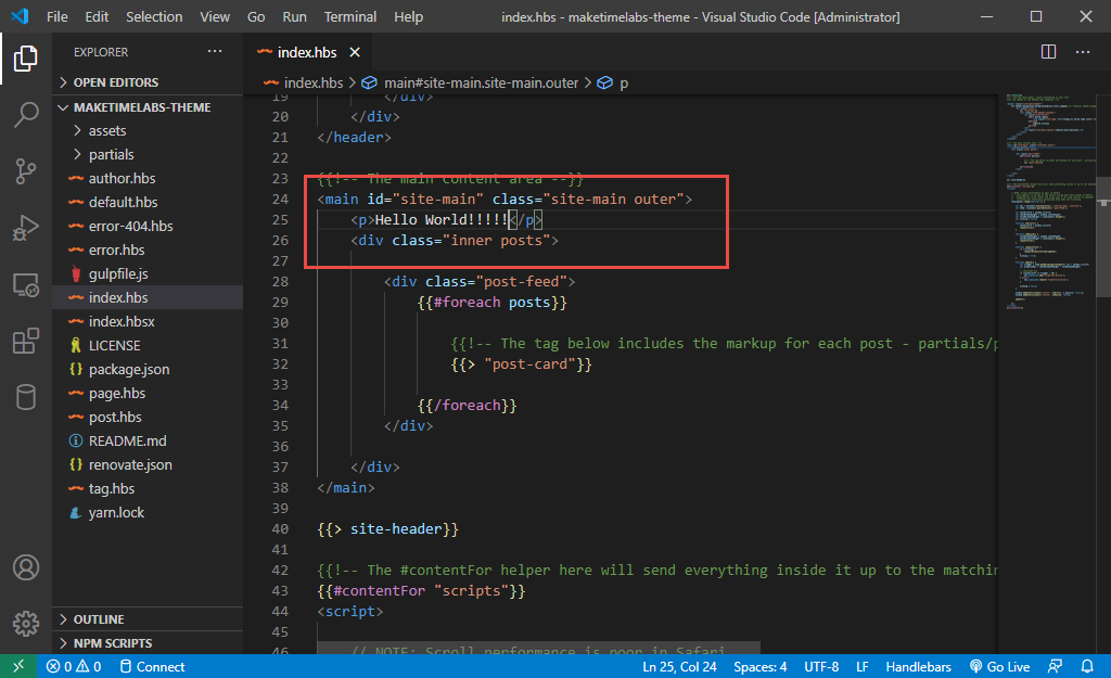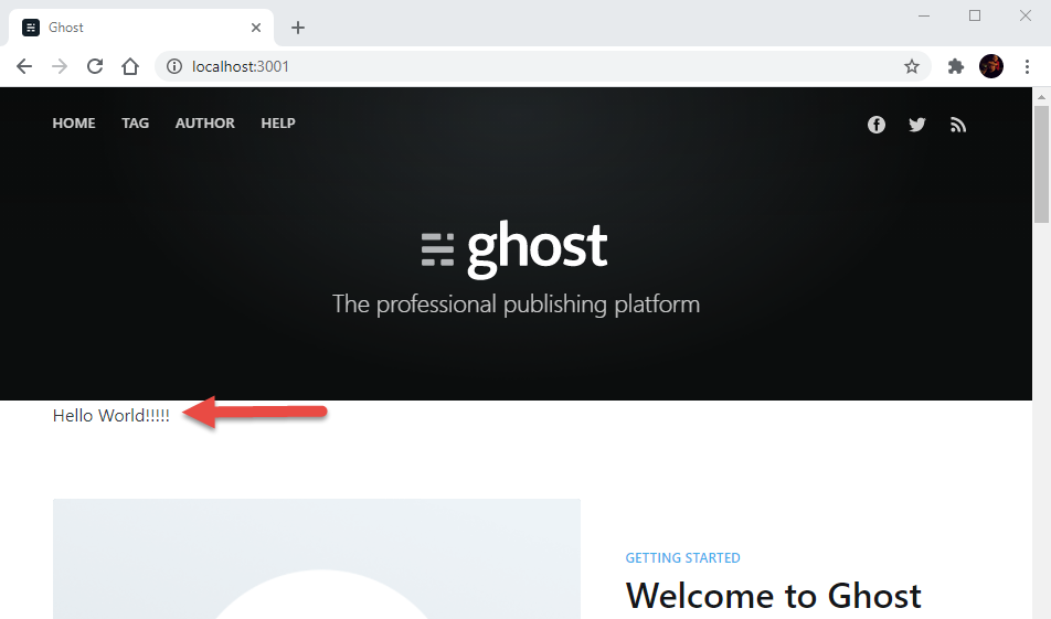 We can make changes to these files and Ghost will automatically rebuild them upon save. After making changes and saving the files you just need to refresh your web page. For example, let's add Hello World to our template.