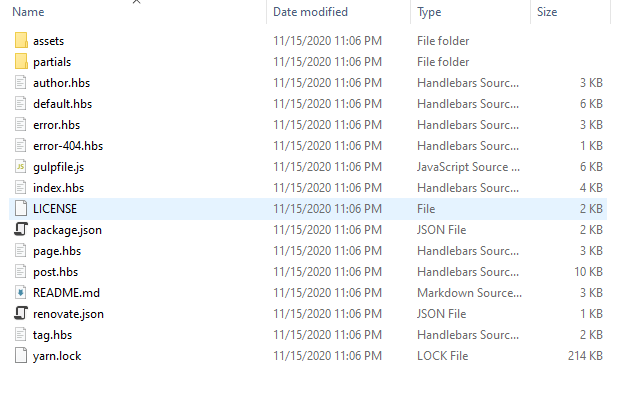 Ghost uses handlebars as its templating engine. I do not know much about handlebars at this time, but rest assured I will in the near future. You can get more information about Handlebars here https://handlebarsjs.com/. The Handlebars files themselves end with the file extension hbs.
