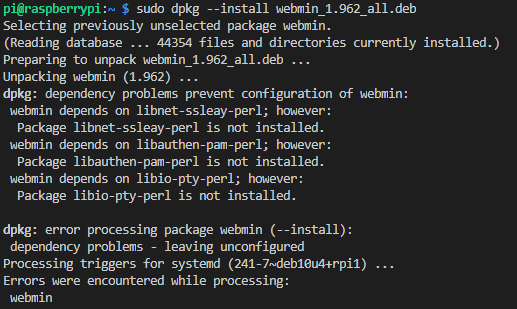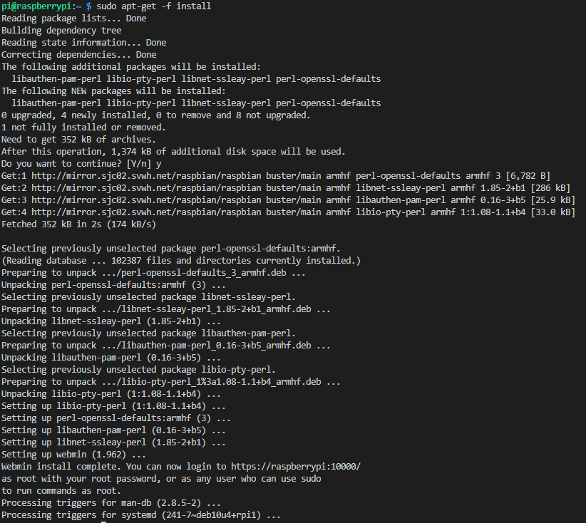 sudo apt-get -f installOnce done you should be able to login to Webmin on you pi via https://raspberrypi:10000 or https://your-pi's-ip:10000. Your username and password should be your normal pi user and pass.