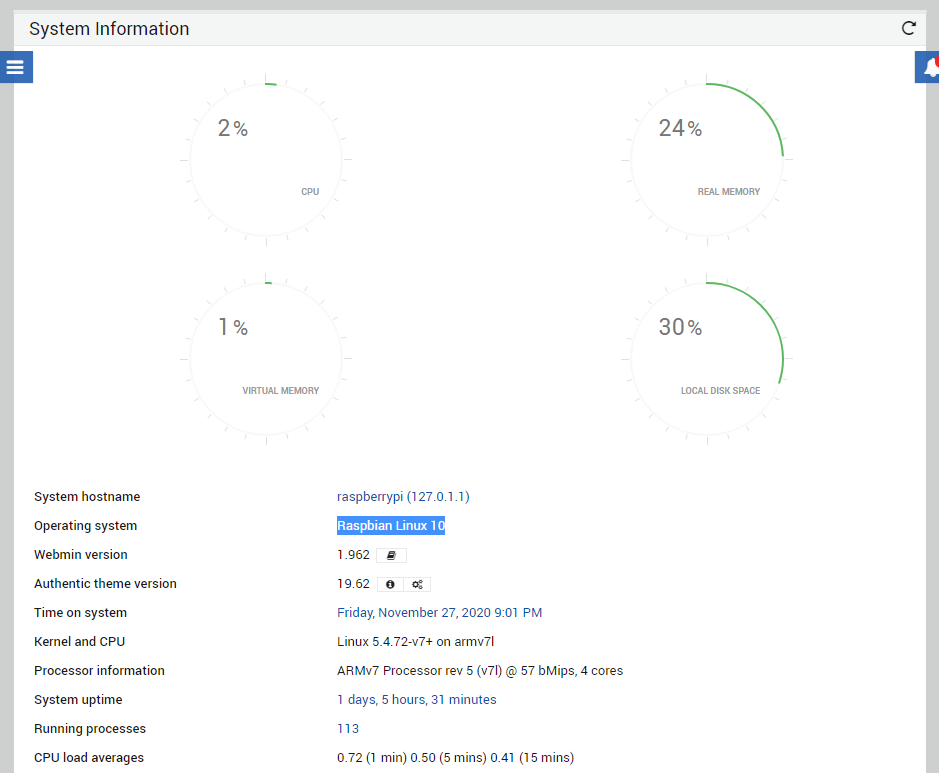 I began wondering if there were issues running the standard Webmin package on Raspberry OS. A few short Google searches later and I was even more confounded. It seems there is quite a bit of information/misinformation regarding Webmin on Raspberry OS. Going directly to the source, the only information regarding Raspberry Pi I could find on the Webmin website was a changelog for version 1.66 adding support for sd cards.