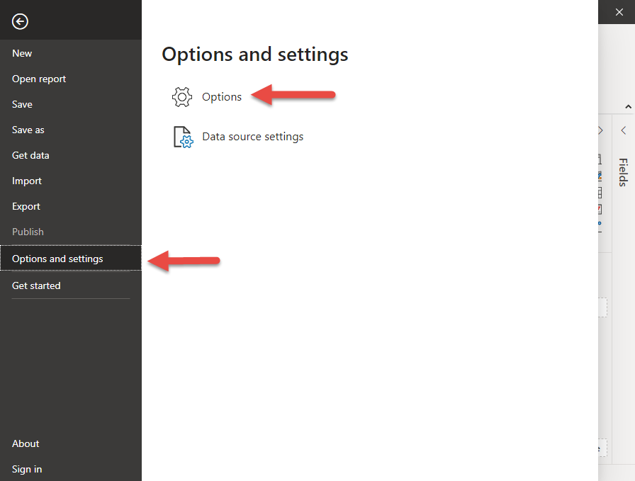 To configure Power BI to use your chosen environment, click File then Options and settings, then Options
