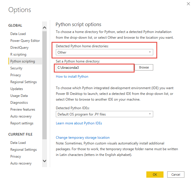 Power BI allows us to use Python. For us to use Python we have to tell Power BI where our Python interpreter is installed. You can use any Python flavor you would like including a custom python virtual environment however for this demo I will be using Anaconda.