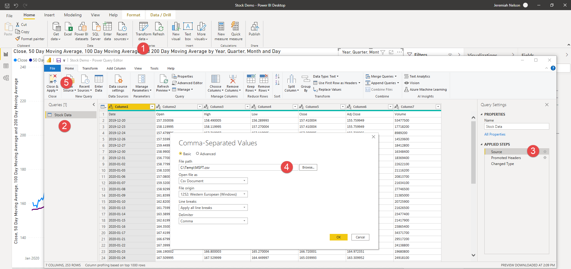 The second way to use python is in the Power Query interface in Power BI (this works in Excel also). Let's assume that we have downloaded a CSV file from Yahoo finance that contains one year's stock trade information for Microsoft. Once we have loaded this file, we spent some time creating measures for 50, 100, and 200-day moving averages, and we have also spent some time building the charts we want to view this data.