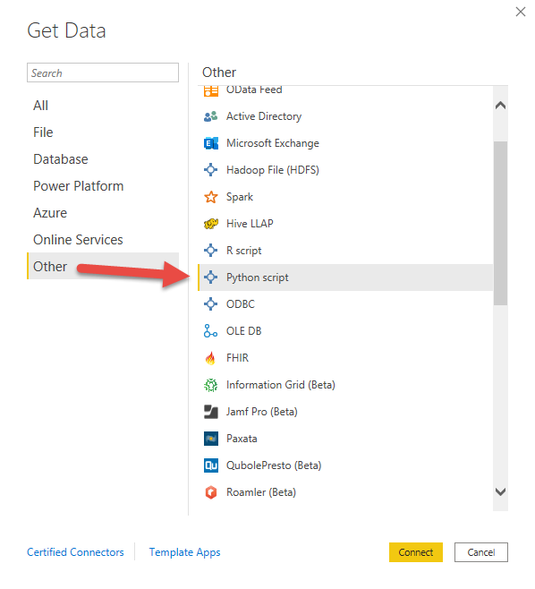Power BI natively understands the pandas dataframe structure. Once we have our code working, we can then use it in Power BI. Open the Power Query interface by clicking Transform Data. From Power Query select New Source, then more. After the Get Data window appears, click other then Python script.