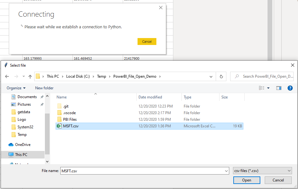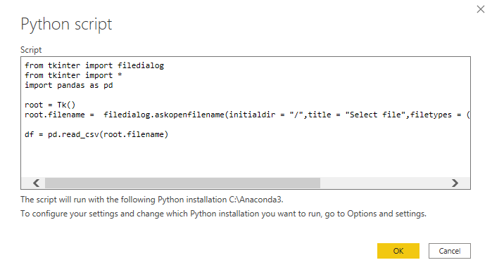 We can simplify this significantly by using Python. Rather than using the built-in Power BI data connectors, let's write our own in Python using tkinter and pandas.