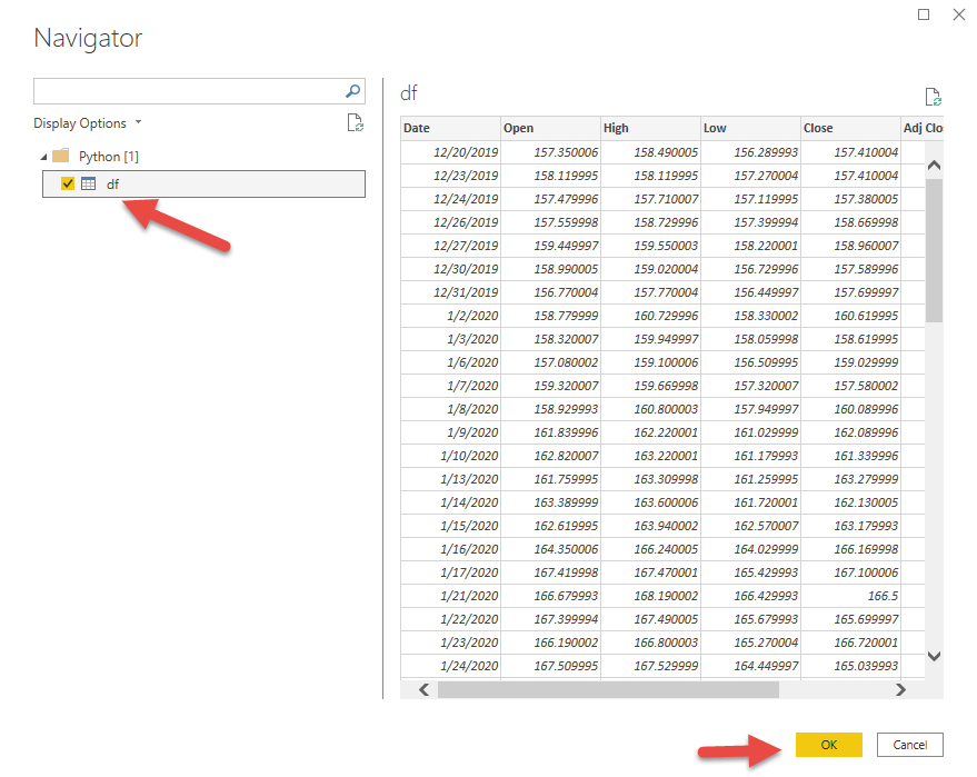 Once it has initialized the script it will give you the Navigator window. Select your dataframe then click OK.