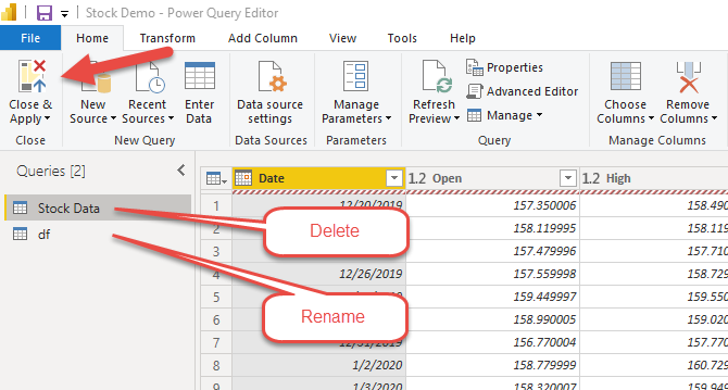 Delete the original data table we created, then rename our new python-based data table to match the original. Then click Close and Apply.